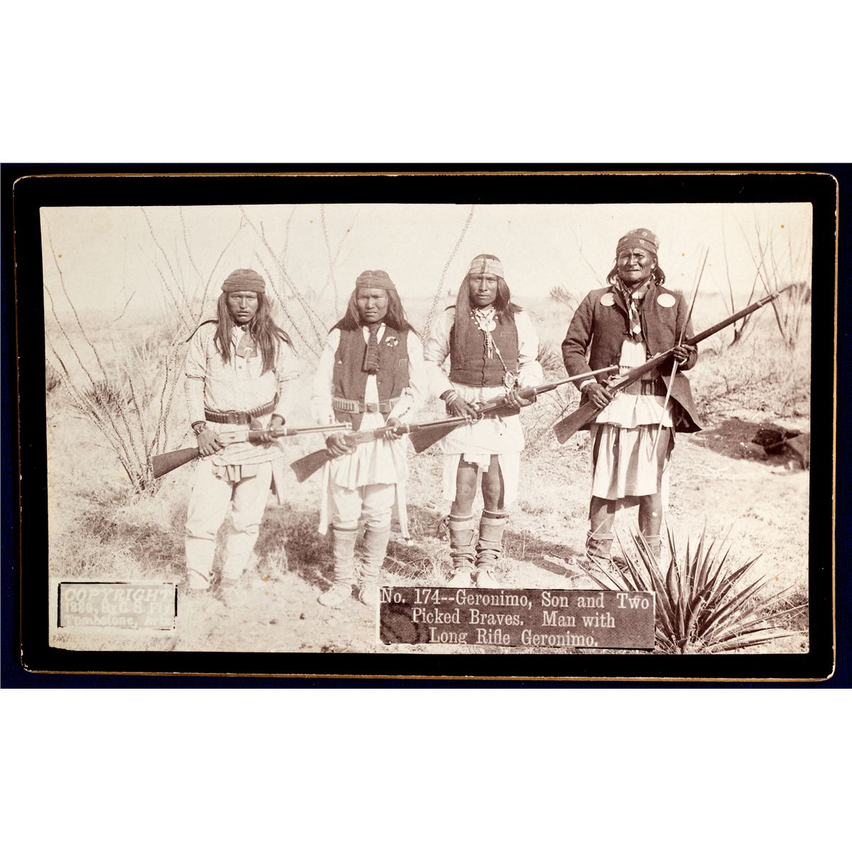 Photograph measures 7.95” x 4.80” and 8.5” x 5.25” on black matte. Medium contrast and focus is sharp. Little wear on matte, photo also has little wear except for some minor fading on the left side from light exposure. Photo was produced by Fly’s Gallery of Tombstone, Arizona. Description on the front reads “No. 174- Geronimo, son and two picked braves. Man with long rifle, Geronimo.” The first Apache in picture is Naiche, youngest son of Cochise. Geronimo was born in New Mexico into the Apache group known as the Chiricahuas. The Apaches were feared by Mexican settlers and many other Southwestern Native groups, in fact the word Apache means “enemy” in Zuni. Geronimo grew up to understand the importance of hunting and survival. As a young man, Mexican soldiers killed his wife, three children and mother. After the attack he campaigned against the Mexican and American Governments until 1886. Geronimo spent the rest of his life as prisoner of war and was never permitted to return to his home in Arizona. In his older years he was hailed as somewhat of a celebrity in American culture, he was even invited to march in President Theodore Roosevelt's 1905 inaugural parade. He died at the age of 79 at Fort Sill, Oklahoma. [Faulk B, Odie The Geronimo Campaign. Oxford University Press. 1969]. - Vinegar Collection
