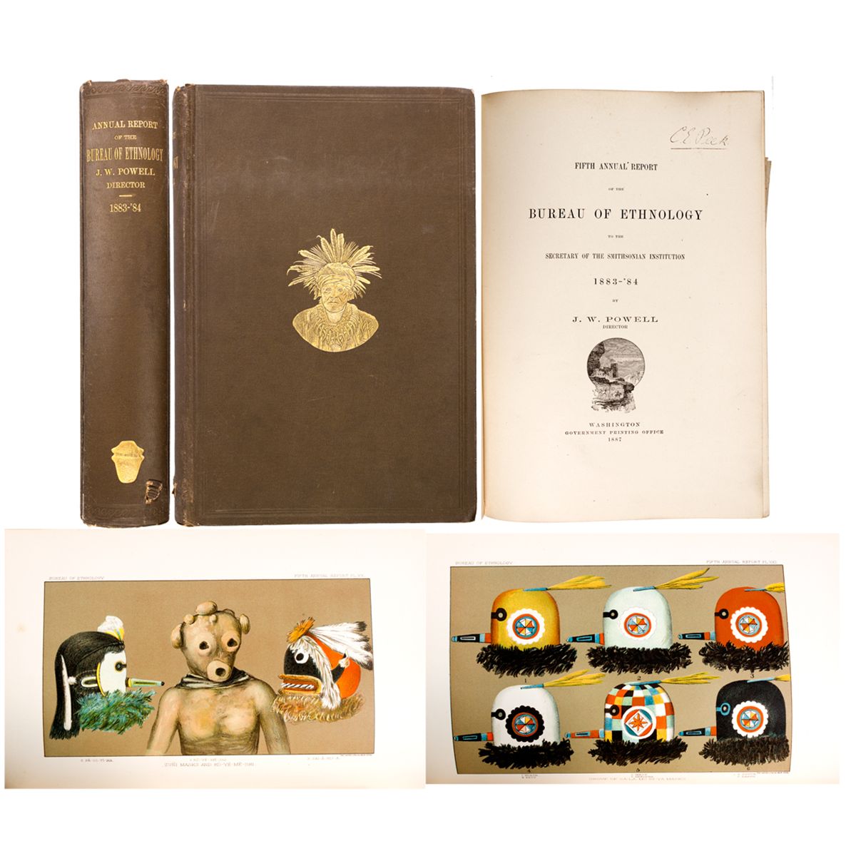 Includes papers on the following: 1) Introduction by J.W. Powell with accompanying reports from field work completed 1883-1884, mainly mound explorations from around the country, 2) "The Cherokee Nation of Indians," by Charles C. Royce. Discusses land cessions, several treaties, and general remarks. 3) "The Mountain Chant: A Navajo Ceremony," by Dr. Washington Matthews, U.S.A. Discusses myth of origin, days and dances of the ceremony, sacrifices, and texts and translation of songs. 3) "The Seminole Indians of Florida," by Clay MacCauley. Discusses personal characteristics, psychical characteristics, Seminole society, tribal life and the environment. 4) "The Religious Life of the Zuni Child," by Mrs. Tilly E. Stevenson (Matilda Coxe Evans.) Stevenson became a noted anthropologist after accompanying her husband on geological tours throughout the United States. She worked with the Bureau of Ethnography for six years. After her husband died in 1886, her work continued and she published additional papers [jah.oxfordjournals.org]. With several full color illustrations of dry-paintings and Zuni masks. There is a pocket at back holding two Cherokee Nation maps (both in color and folded.) Hardbound in brown cloth with lettering and illustration of Native Person in gilt. 564 pp. 8" x 10.5".