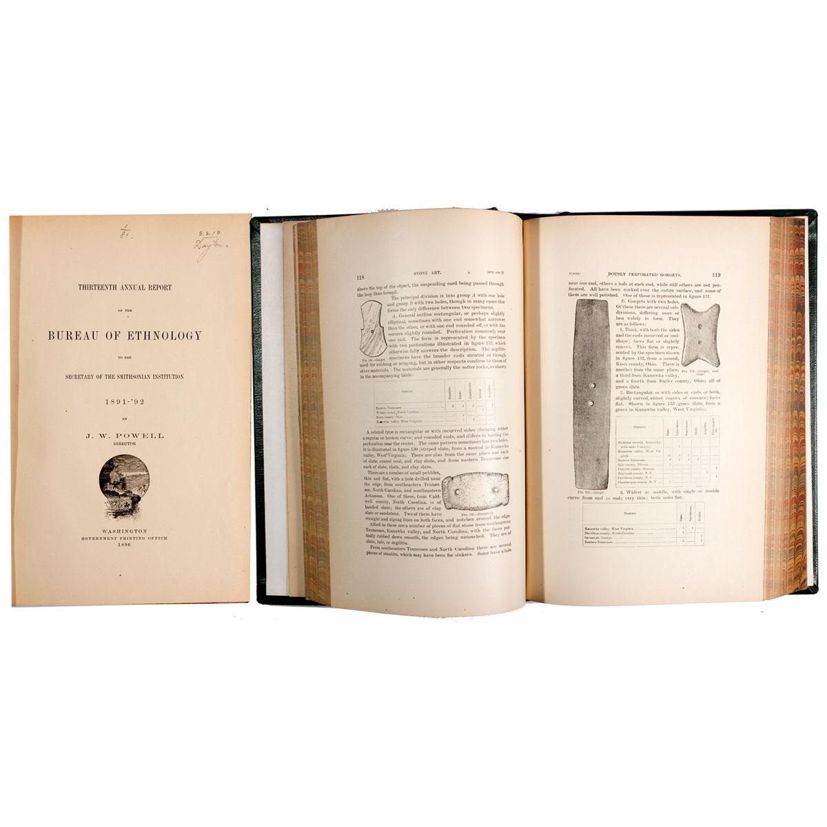 Includes Introduction by J.W. Powell and the following papers: "Prehistoric Textile Art of Eastern United States," Holmes, William Henry. Holmes produced volumes of work in ethnography leading to an event at his 70th birthday where his friends presented him with "The Holmes Volume," 500 pages of essays produced by Holmes during his career. After his post as Chief for the Bureau of Ethnology, Holmes dedicated the rest of his career to work in museums. Late in life, he became Director of the newly established National Gallery of Art. One of his notable phrases is, "Make it tell the story," here not only good advice for museum work but also for work in any field of the liberal arts [aaanet.org]. 2) "Stone Art," Gerard Fowke. Fowke's ongoing archaeological investigations here focuses on stone art such as chisels, grooved axes, cones, mullers, hammer stones, spades, stemmed flints and blunt arrowheads or "bunts". 3) "Aboriginal Remains in Verde Valley, Arizona," Mindeleff, Cosmos. 4) "Omaha Dwellings, Furniture and Implements," Dorsey, J. Owen. Ongoing further investigations of the Omaha tribe, its goods and customs. 5) "Casa Grande Ruin," Mindeleff, Cosmos. Includes first accounts of Mindeleff's investigation of the preservation of Casa Grande, the first prehistoric site to be preserved by the United States government. See Reports 15 and 17 for additional information. 6) "Outlines of Zuni Creation Myths," Cushing, Frank Hamilton. With 60 plate illustrations and 330 text figures. Rebound in green cloth with lettering in gilt. 462 pp. 8" x 10.5.". - Vinegar Collection