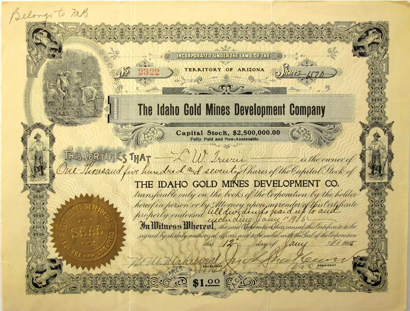 Certificate No. 2322 issued to L.W. Irvine for 1570 shares at $1 per share on January 12, 1905. When the stock was issued Idaho Gold Mines Development Company had capital stock valued at $2,500,000. Certificate has a light gray ornate border a gold-colored seal in the lower left hand corner. There are 6 small vignettes within the border and a larger vignette adjacent to the stocks title featuring 4 miners at work. The back side of the certificate has light green border and lettering. The certificate was originally folded in thirds and is in good condition.
