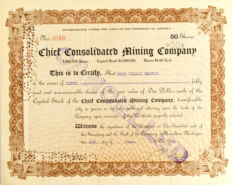 Incorporated under the laws of the Territory of Arizona. Certificate No. 3010 issued to Miss Tillie Mackay for 50 shares on June s, 1909. Signed by G.P. Seargent as Secretary and T.M. Deuter as President. No vignette, fancy border in brown ink with text in black. Embossed seal at lower left. Cancelled by large stamp across face with blue ink. Very fine condition.