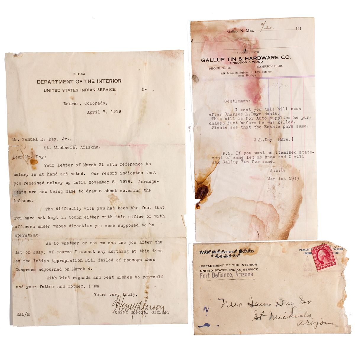 Lot of 3 items. 1) Letter from the U.S. Indian Service to Samuel Day. Letter measures 10.35” x 6.75” on white paper with black ink. Letter is concerning Samuel Day’s salary. Letter has wear; there are creases, stains and tears. 2) Bill statement, measures 4.60” x 8.35.” From Gallup Tin & Hardware Co. Bill is concerning items bought Mr. Day before his death. Bill has wear, stains and slight creases. 3) Envelope from Fort Defiance, measures 6.5” x 3.55.” A 2 cent red revenue stamp is located in the upper right corner. There are tears on the right side and there are some stains present. - Vinegar Collection