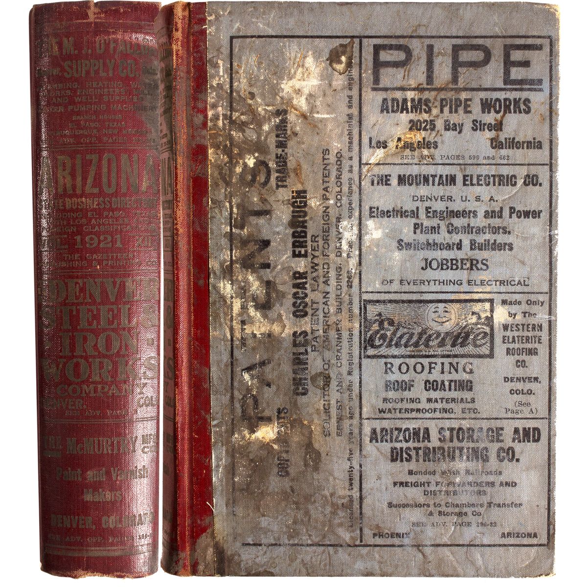Hardcover directory, measures 9.25” x 6.25” and is 965 pages. There is some wear on the binding and pages, and the cover has nicks and marks. Not only did the directory cover Arizona, but also “El Paso, Texas with Los Angeles and Foreign Classifications including live stock department, wool growers’ department and the classified department.” Produced by the Gazetteer Publishing and Printing Co. of Denver, C0.