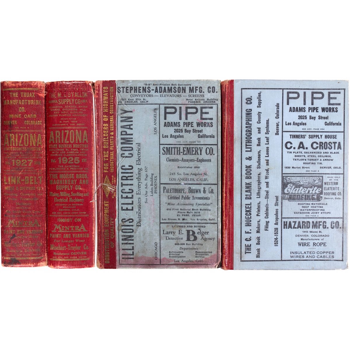 Lot of 2 hardcover directories. 1) 1925. Has some wear on the cover and binding, little wear on the pages, except for 1 page that is detached. 2) 1927. Has some wear on the binding and cover. The pages also have slight wear from water damage. The directories provide information of the state of Arizona but also listings for “El Paso Texas and Los Angeles and cities classified department including live stock department wool growers’ department classified department.” Both produced in Denver Colorado by the Gazetteer Publishing Co.
