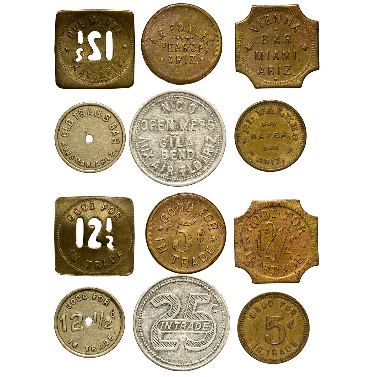 Lot of 6. 1) Kingman Old Trails Bar. GF12 1/2c IT. Fine. 2) Gila Bend. NCO. GF25 1/2c IT AU. 3) Mayer Red Walker. GF5c IT. Fine. 4) Miami Vienna Bar. GF12c IT. Fine. 5) Pearce EE Powles. GF 5c IT. VG. 6) Ray, Del Monte. GF 12 1/2c IT. XF.
