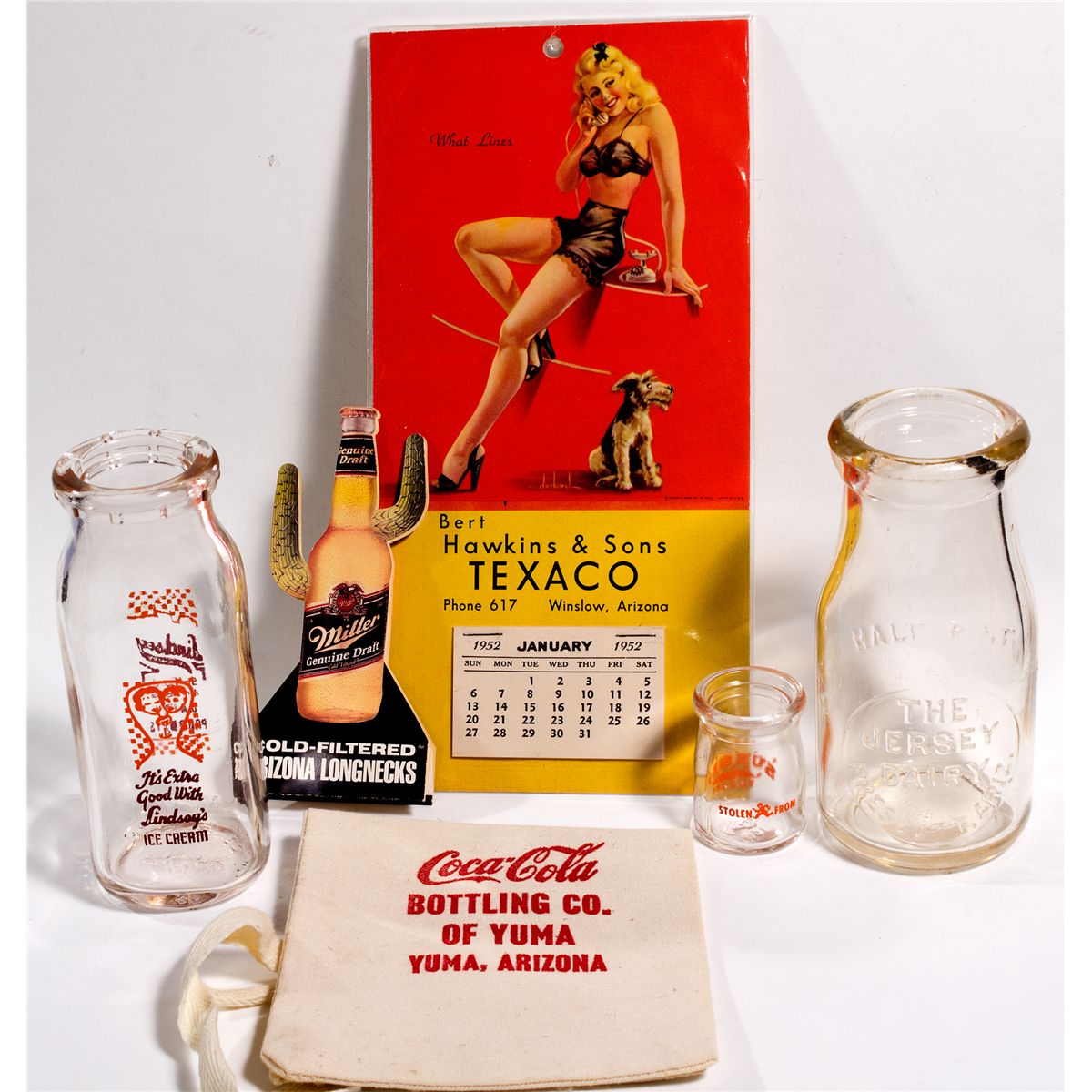 Lot of 6. 1) Round 1/2 pint Jersey Dairy Prescott, AZ. 2) Square 1/2 pint Lindsey Creamery Dairy Products, Safford, AZ, orange and red pyro. 3) Round Sunset creamer, Tucson, AZ orange pyro. With "Stolen From" on reverse. 4) Bert Hawkins & Sons Texaco pinup calendar (1952) with Deckard illustrated pinup girl. Winslow, AZ. 5" x 10". 5) Coca Cola Bottling Co. Canvas bottle tote, Yuma Az. 4.5" x 9.5". Miller Genuine Draft "Cold-Filtered Arizona Longnecks" table advert with cactus motif. 2.5" x 5". - Vinegar Collection