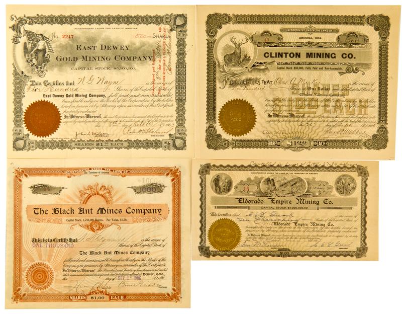 Lot of four. 1) East Dewey Gold Mining Co. Incorporated in Arizona, 1902. No. 2247 issued Oct. 8, 1903 to W.G. Wayne for 500 shares. Signed by Robert B. Graham, Pres., John McLean, Secr. Blk with gray underprint on crème. 2) Clinton Mining Co. Incorporated in Arizona, 1896. No. 43 issued Sept. 26, 1906 to Chas. A. Meeken for 500 shares. Black with gold underprint on crème. Vignette of buck at upper right. Gilt seal. 3) The Black Ant Mines Co. Incorporated Arizona Territory. No. 260 issued Sept 1, 1906 to J. J. Fitzgerald for 1000 shares. Signed Bruce Glidden, Pres., Henry Weber, Secr. Black with red underprint on crème. 4) Eldorado Empire Mining Co. Incorporated Arizona Territory, 1907. No. 16 issued May 24, 1907 to C.E.L. Gresh for 10,000 shares. Signed C.E.L. Gresh, Pres., Ben McLendon, Secr. Blk on crème. Gold seal.