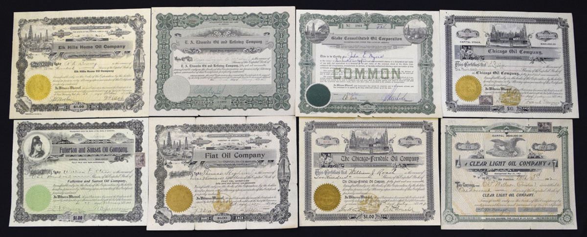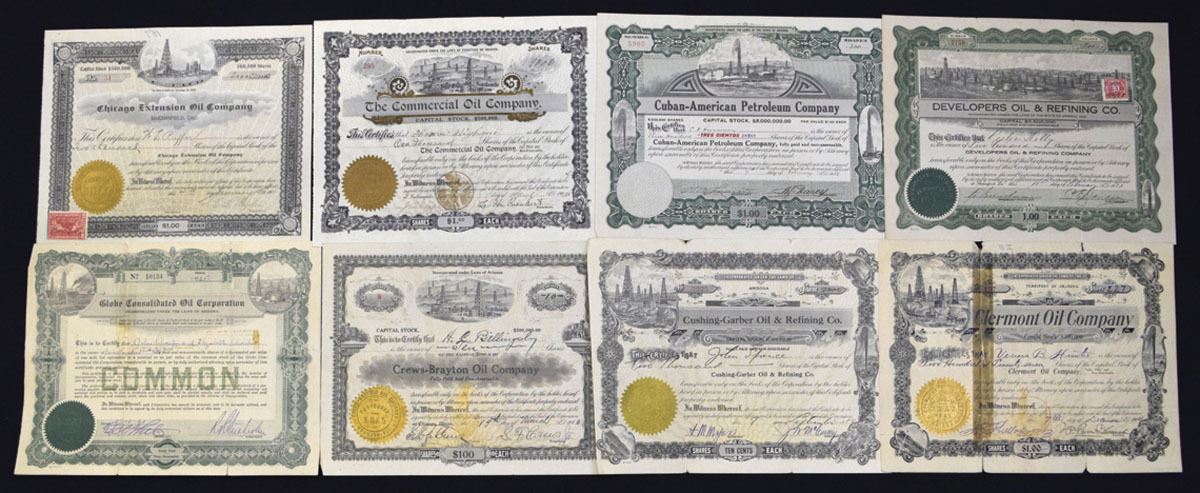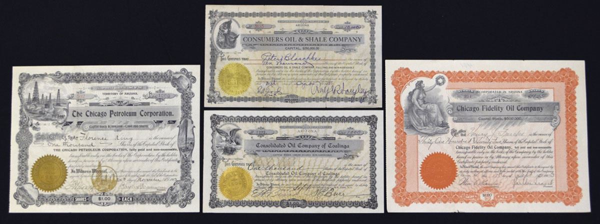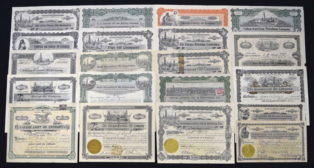Arizona & California, 1900-21. Lot of 20 I/U stock certificates from numerous regional and speculative oil ventures, many incorporated in Arizona and California, with ornate engraved designs and oil field vignettes. Highlights include: Chicago Petroleum Corp.; Consumers Oil & Shale Co.; Chicago Fidelity Oil Co.; Globe Consolidated Oil Corp.; Cuban-American Petroleum Co.; and Clear Light Oil Co. Certificates have colorful borders, embossed seals, and occasional revenue stamps. Most are issued and cancelled examples, showing typical folds, edge wear. (20). Sold "AS IS" no returns accepted.