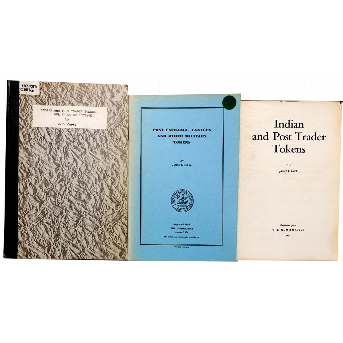 Lot of 3. 1) Curto, James J. Indian And Post Trader Tokens. Reprinted from The Numismatist. Includes information on the Hudson Bay Co. with photographic examples of associated tokens, etc. Discusses Frontier Post Tokens, Trader Tokens and Agency Tokens. No publishing date. Soft cover/staple bound. 23pp. 5.5" x 8.5". 2) Curto, J.J. Indian and Post Trader Tokens. Our Frontier Coinage. Includes examples of E.H. Durfee, G.W. McAdams, Grady Trading Co., etc. Pamphlet bound (ex-library). 21pp. 6.5" x 9.5". 3) Curto, James J. Post Exchange, Canteen and Other Military Tokens. Reprinted from The Numismatist, 1954. Includes plates of PX tokens (forts and regimentals) with associated written descriptions. Pamphlet bound. Roughly 50pp. 6" x 9". - Vinegar Collection