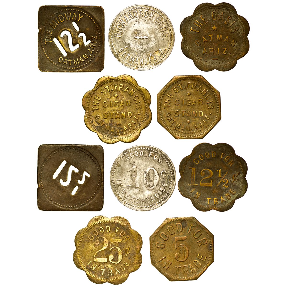 Lot of 5:  1) The Midway. 12 1/2 cutout. XF. 2) The Oasis. GF12 12/2IT. Fine. 3) Richardson Bros. GF10cIM. Good. 4) St. Francis Cigar, oct. GF5cIT. Fine. 5) St. Francis Cigar, scal. GF25cIT. Good. Oatman was named after Olive Oatman who was of the family that was massacred by the Apaches in 1851 at the Gila River. The post office was established here in 1909 [Barnes, Will C., 1988].