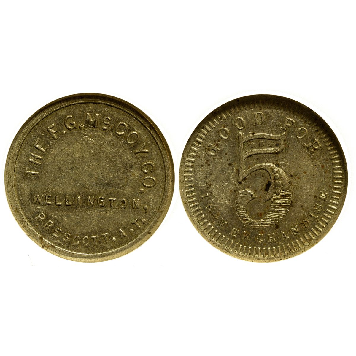 An excellent and rare 5 cent merchandise credit at The F.G. McCoy Company. This token is in very nice to excellent condition.