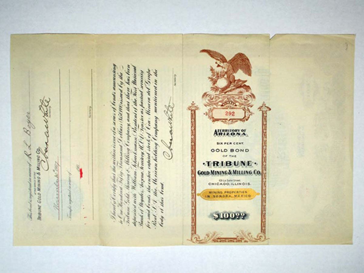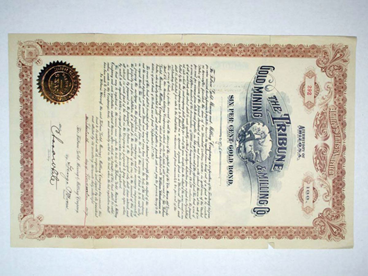 Arizona Territory. The Tribute Gold Mining & Milling Co. 1907. $100 6% Bond. F-VF