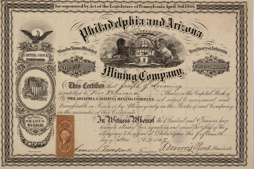 Wauba-Yuma District. Incorporated in Pennsylvania in 1866. Cert. #33 issued to Joseph F. Sovering for 5,000 shares. Signed by T. Morris Perot, president and by Samuel Townsend, treasurer. Elaborate central vignette of the Pennsylvania state seal. Fancy black border and print on crème paper with embossed seal. Applied 25cent federal revenue stamp. U/C. Printer: J. Haehnlen, Phila. Datelined Philadelphia. 7 ½ x 11.”