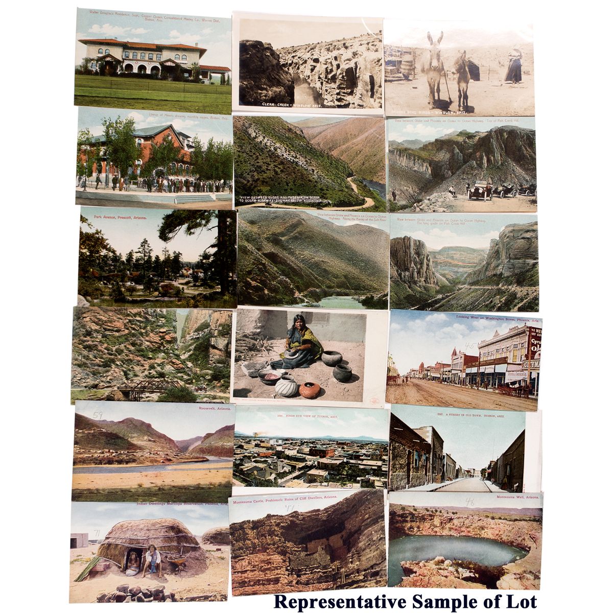 Lot of 56: Includes 21 tinted RPCs of native peoples in various scenes including boarding a train & sitting with baskets. Also an image of “Vicenti, Chief of the Navajos, standing with his horse by a creek (1907). Images of the Papago tribe, Pima tribe, Moki tribe, Hopi tribe, Sioux tribe, and Pueblo tribe. 2 RPC's: 1) A scene of Winslow, AZ showing two burros facing the camera. 2) Clear Creek winding through a canyon. 33 tinted RPC's of rural Arizona scenes. Phoenix, Bisbee, Tucson, and Prescott are all represented.