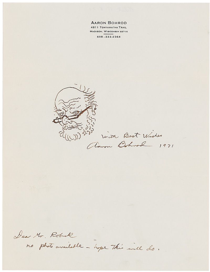 Original signed ink self-portrait on an off-white 8.5 x 11 sheet with personal letterhead, signed, “With best wishes, Aaron Bohrod, 1971,” with a note at the bottom, “Dear Mr. Robuck, no photo available—I hope this will do.” In fine condition. Accompanied by the original mailing envelope addressed in Bohrod’s hand, including a last name signature in the return address area.