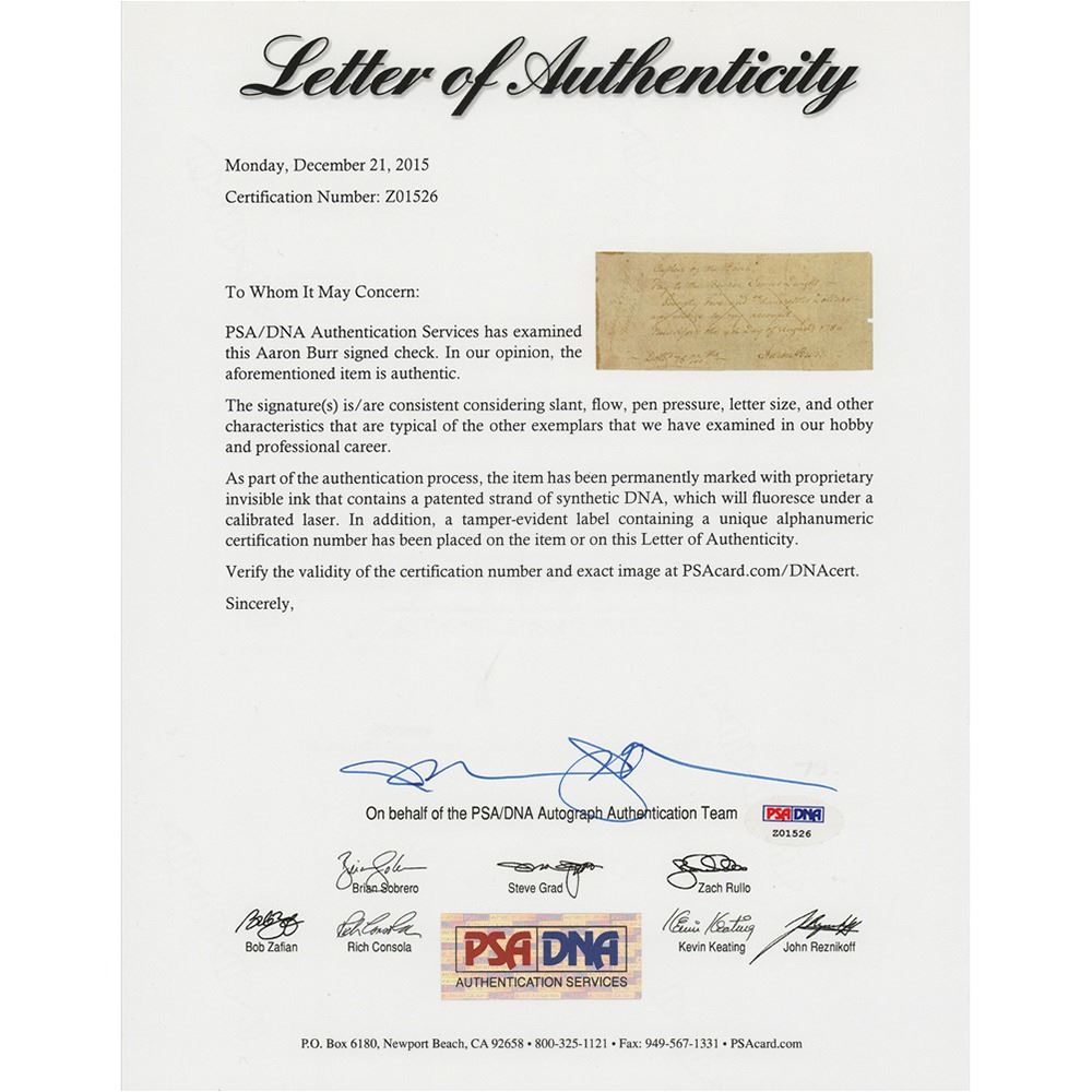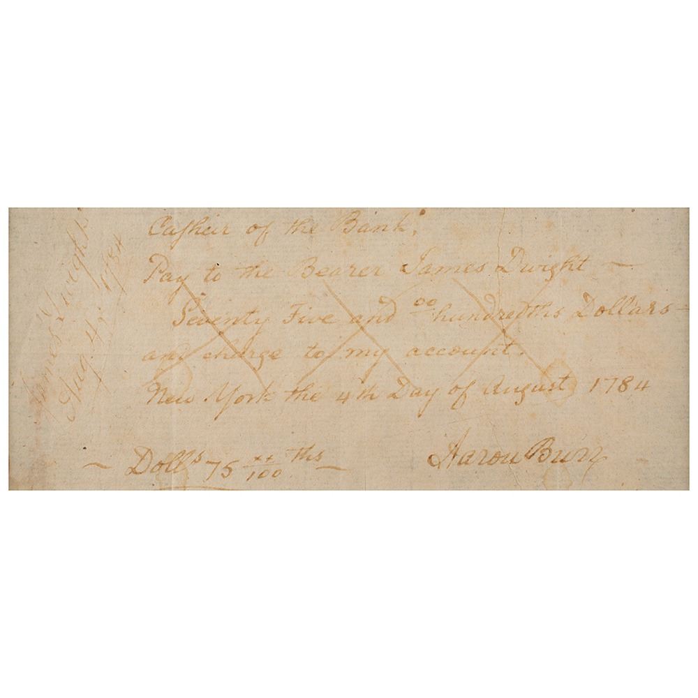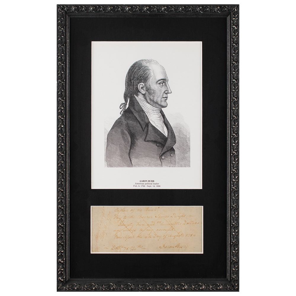 Autograph check, 8 x 3.5, written entirely in Burr's hand and signed in full, "Aaron Burr," payable to "Bearer James Dwight" for $75, August 4, 1784. Nicely matted and framed with a portrait to an overall size of 12.25 x 19.25. In fine condition, with the handwriting a few shades light but completely legible. Accompanied by a full letter of authenticity from PSA/DNA.
