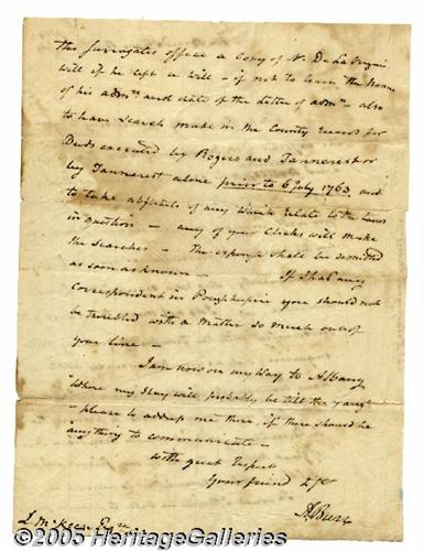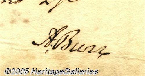 <B>Aaron Burr Autograph Letter Signed Written on Board a Steamboat in 1814 Regarding Land Claims Dating to 1763, "...it is of great moment to one of my friends and fellow soldiers..."</B></I> A New York Senator, Aaron Burr (1756-1836) was Jefferson's Vice President, but was replaced because of political and personal differences. After he killed his political enemy, Alexander Hamilton, in a duel, he was indicted for murder and fled west, though the charges were dropped. He later tried to establish an independent country composed of Mexico and the southwestern states and was tried for treason. Although acquitted, he fled to Europe for four years before returning to America. Autograph letter signed, 2 pages, July 24, 1814, On Board Steam Boat. The letter reads, "Dear Sir: I take the liberty of enclosing to you the ...mortgage of two tracts of land executed in 1775...you will inform me if in your power who are the present representatives...and particularly who now occupy the lands described...I do not mean to charge you personally with the trouble of making these inquiries, but as you know every body...it is of great moment to one of my friends and fellow soldiers and of some little to myself...a copy of De La Vigner's will if he left a will - if not to learn the name of his adm'r and date of the letter...If I had any correspondent in Poughkeepsie you should not be troubled with a matter so much out of your line...Your friend, A. Burr". <I>Accompanied by COA from PSA/DNA.</B></I>