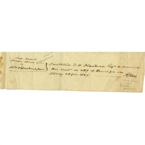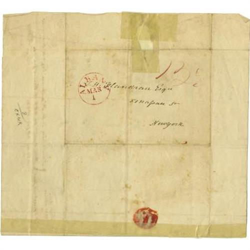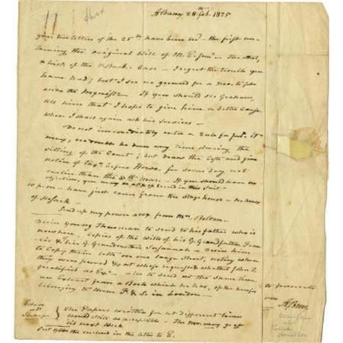 <B>Aaron Burr Autograph Letter Signed twice "</B></I><I>A. Burr" </B></I>and a scarce full signature, "<I>Aaron Burr".</B></I> Two pages, 7" x 7.75", Albany, February 28, 1825 to T. H. Flandrau concerning legal matters. He writes, in part: "<I>Your two letters of the 25th have been recd-the first containing the original will of M.E. Zorn - the other, a list of V. Berk case - I regret the trouble you have had; but I see no ground for a move to set aside the Inquests. If you should see Graham, tell him that I hope to give him a better cause when I shall gain ask his services. Do not immediately enter a plea for Jost. I may, no doubt be done any time during the sitting of the Court; but draw the costs and give notice of taxn. Before Howe for some day not earlier than the 8th Mar. If you should have no objections, you may be atty of record in this suit. 10 p.m.-have just come from the Stat house-no news of Hossak. Send up my power of atty form Mrs. Bolton-Desire young Thurman to send to his father who is now here, copies of the Wills of his G. Grandfather Francis & of his G. Grandmother Susannah - desire him to copy them both on one large sheet, noting when they were proved & at whose request & whether John T. qualified as Exr- also to send at the same time an Extract from a Book which he has, of the houses belonging to them F. & S. in London.</B></I>" Following his trial for treason and subsequent self-imposed European exile, Aaron Burr returned to New York City in 1812 where he began his final career as a successful, albeit obscure, attorney. He died in New York in 1834. Small loss from seal tear repaired, usual folds, light toning, else very good. <I>Ex. Henry E. Luhrs Collection</B></I><BR><BR><BR><b>Shipping:</b> Flat Material, Small (<a target="_blank" href="http://www.heritageauctions.com/common/shipping.php">view shipping information</a>)