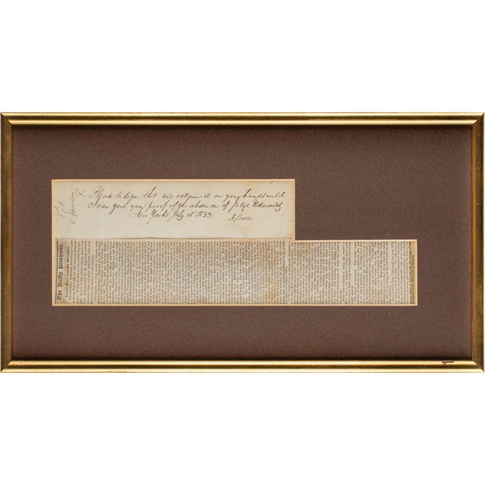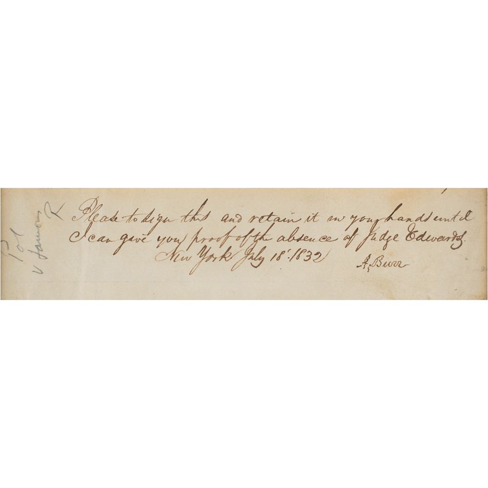 Manuscript DS, signed “A. Burr,” one page, 7.75 x 4, July 18, 1832. In full: "Please to sign this and retain it in your hands until I can give you proof of the absence of Judge Edwards." Affixed beside a later newspaper clipping from The Daily Picayune, chronicling Burr's relationship with his daughter. Matted and framed to an overall size of 8.5 x 15.5. In fine condition, with some light creasing. Provenance: Lot 348, Sotheby's, June 2, 1980.