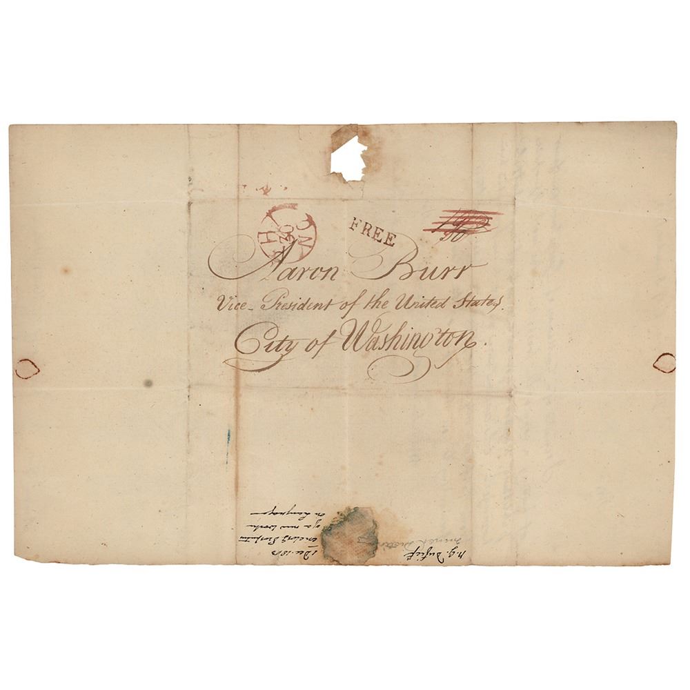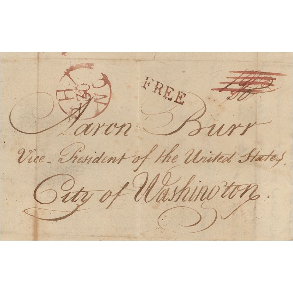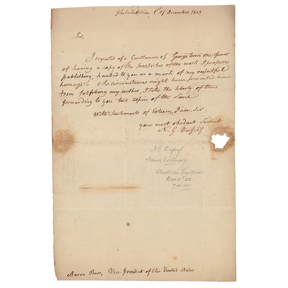 ALS signed “N. G. Dufief,” one page, 7.75 x 11.75, December 1, 1803. Handwritten letter to "Aaron Burr, Vice President of the United States," in part: "I requested a Gentleman of Georgetown the favor of having a copy of the prospectus of the work I propose publishing, handed to you on a mark of my respectful homage. As circumstances might have prevented him from fulfilling my wishes, I take the liberty of thus forwarding to you two copies of the same." Addressed on the reverse in another hand to "Aaron Burr, Vice-President of the United States, City of Washington," and boldly docketed in Burr's hand: "N. G. Dufief, 1 Dec. 1803, enclos'g Prospectus of a new work on Language." In very good to fine condition, with some scattered staining and an area of loss from seal removal.