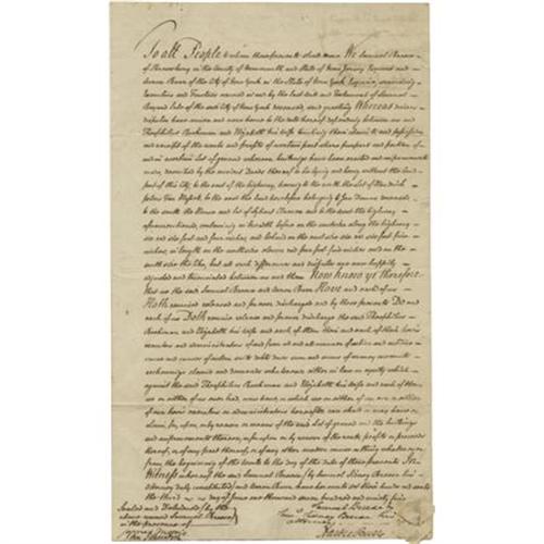 <B>Aaron Burr Manuscript Document Signed</B></I> "<I>Aaron Burr</B></I>," one page, 7.75" x 12.75". [no place], June 3, 1795. In part, "<I>To all People to whom these presents shall come We Samuel Breese of Shrewsbury in the County of Monmouth and State of New Jersey Esquire and Aaron Burr of the City of New York in the State of New York Esquire, surviving Executors and Trustees named in and by the last Will and Testament of Samuel Bayard late of the said City of New York deceased, send greeting. Whereas divers disputes have arisen...between us and Theophilus Beekman and Elizabeth his wife touching their claim to, and possession and receipt of the rents and profits of a certain part share...and portion of and in a certain Lot of ground whereon buildings have been erected and improvements made...but all such differences and disputes are now happily adjusted and terminated between us and them. Now know ye therefore that we the said Samuel Breese and Aaron Burr Have and each of us Hath remised released and forever discharged and by these presents Do and each of us Doth remise release and forever discharge the said Theophilus Beekman and Elizabeth his wife...of and from all and all manner of action and actions cause and causes of action suits debts dues sum and sums of money accounts reckonings claims and demands whatsoever either in law or equity...</B></I>" Signed "<I>Samuel Breese by Saml Sidney Breese his attorney</B></I>" (and 26-year-old son) directly above Burr. Samuel Breese's grandson was inventor Samuel Finley Breese Morse. Signed at the bottom left "<I>James Morris</B></I>" and "<I>John Johnston</B></I>" as witnesses for Samuel Breese and again on verso, at the top, as Aaron Burr's witnesses. Docketed on verso of the integral page in unknown hand: "<I>Saml Breese et al to Aldn Beekman et Eliz - Release as within</B></I>." Alderman Theophilus Beekman was one of the first two Special Justices of New York City later appointed by the Governor. Unlike the rest of the state, the city had no Justices of the Peace; other public officials had powers similar to those they held elsewhere. Samuel Breese's father, Sidney Breese, and Samuel Bayard had married sisters Elizabeth and Catherine Carpenter, respectively. It is interesting to note that nine years earlier, in 1786, Catherine Bayard, widow of Samuel Bayard, charged that the executors of her deceased husband's estate, Burr, Breese (her nephew), and William Malcolm (her niece's husband), were defrauding her by refusing to convey to her a house which her husband had purchased from her mother's estate. Her lawyer was Alexander Hamilton who, in 1804, was killed by then-Vice President Aaron Burr in a duel. At the time he signed this document, Burr was U.S. Senator from New York. He had defeated the incumbent, General Philip H. Schuyler, Alexander Hamilton's father-in-law, in 1790. Small paper seals affixed with red wax to the right of Breese's and Burr's signatures. The document, on watermarked laid paper, is in fine condition.<BR><BR><b>Shipping:</b> Flat Material, Small (<a target="_blank" href="http://www.heritageauctions.com/common/shipping.php">view shipping information</a>)