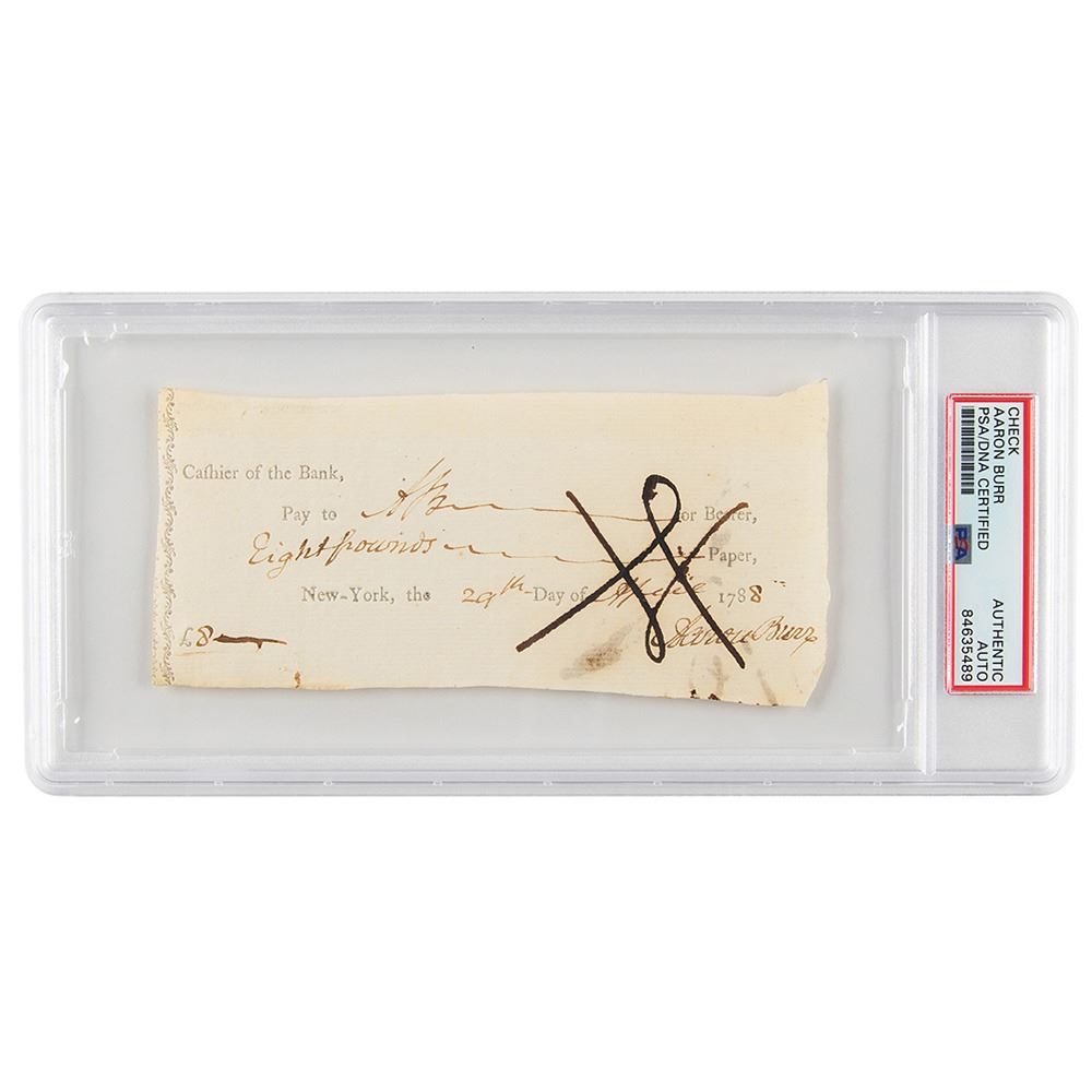 Bank check, 6 x 2.75, filled out and signed by Burr, "Aaron Burr," payable to "A.B." for "Eight pounds," April 29, 1788. In fine condition. Encapsulated in a PSA/DNA authentication holder.