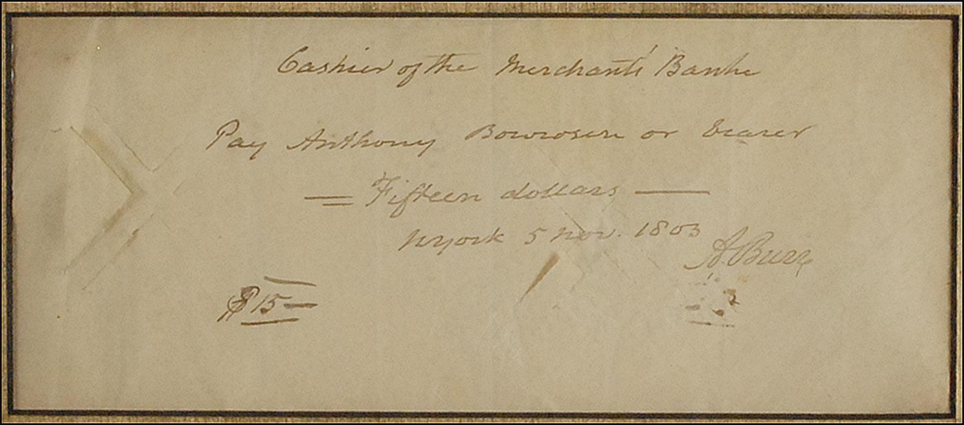 Manuscript check, 8 x 3.5, filled out in another hand “Cashier of the Bank of the Merchantile Bank. Pay Anthony Bowrosen or Bearer, Fifteen Dollars,” and signed at the conclusion, “A. Burr,” dated November 5, 1803. Double-matted and framed to an overall size of 13.5 x 9. In very good condition, with a few creases, two cancellation cuts to body, ink spotting, and edge toning and soiling. At the time, Burr was serving as vice president under Thomas Jefferson.