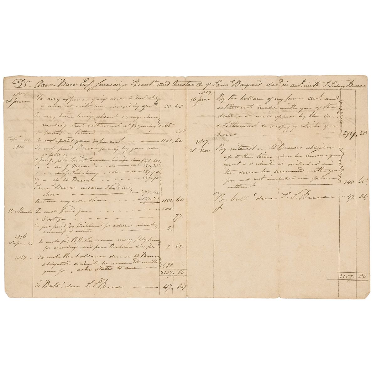Endorsement signed “A. Burr,” after a statement written in another hand which reads, “I have examined this a/c approve of the same & allow it. Aug. 15th 1823,” on the reverse of a 12 x 7.5 manuscript document, being a balance sheet headed “Aaron Burr Esqr. Surviving Execut[o]r and Trustee & of Saml Bayard dec[eased]d in acct. with S. Sidney Breese,” with several financial entries of monies coming in and going out. Written on the reverse in another hand is “I have this day examined and Settled the within amount with S. Sidney Breese and do hereby release & discharge him from the balance due from him on former settlement. (he having within accounted for the disposal of the same)–and from all demands whatever. Witness my hand and seal this [blank] day of [blank] 1823.” In very good condition, with intersecting folds, scattered toning, light show-through from writing on reverse, and a bit of light soiling.