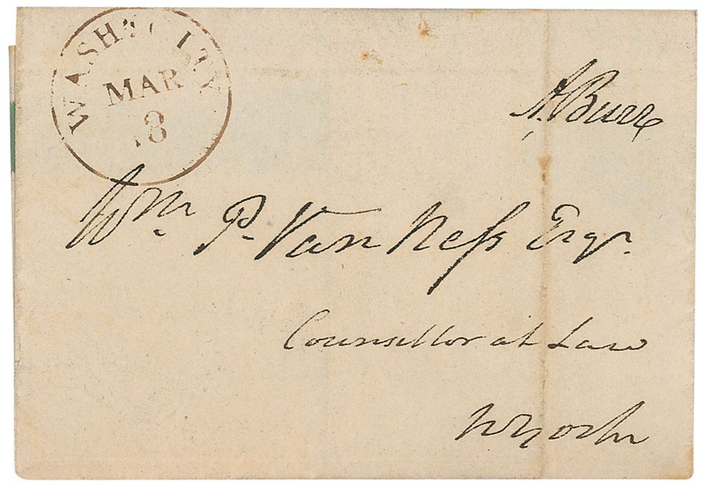 Full free frank, measuring 9.75 x 7.75 unfolded, with panel measuring 4.25 x 3, addressed in another hand to “Wm. P. Van Ness Esqr., Counsellor at Law,” and franked in the upper right “A. Burr.” Frank bears a March 18, 1802, docketing notation in the upper edge. Vertical fold through panel affecting first letter of signature, scattered light toning and soiling, and paper loss and mounting remnants along bottom edge, otherwise fine condition.