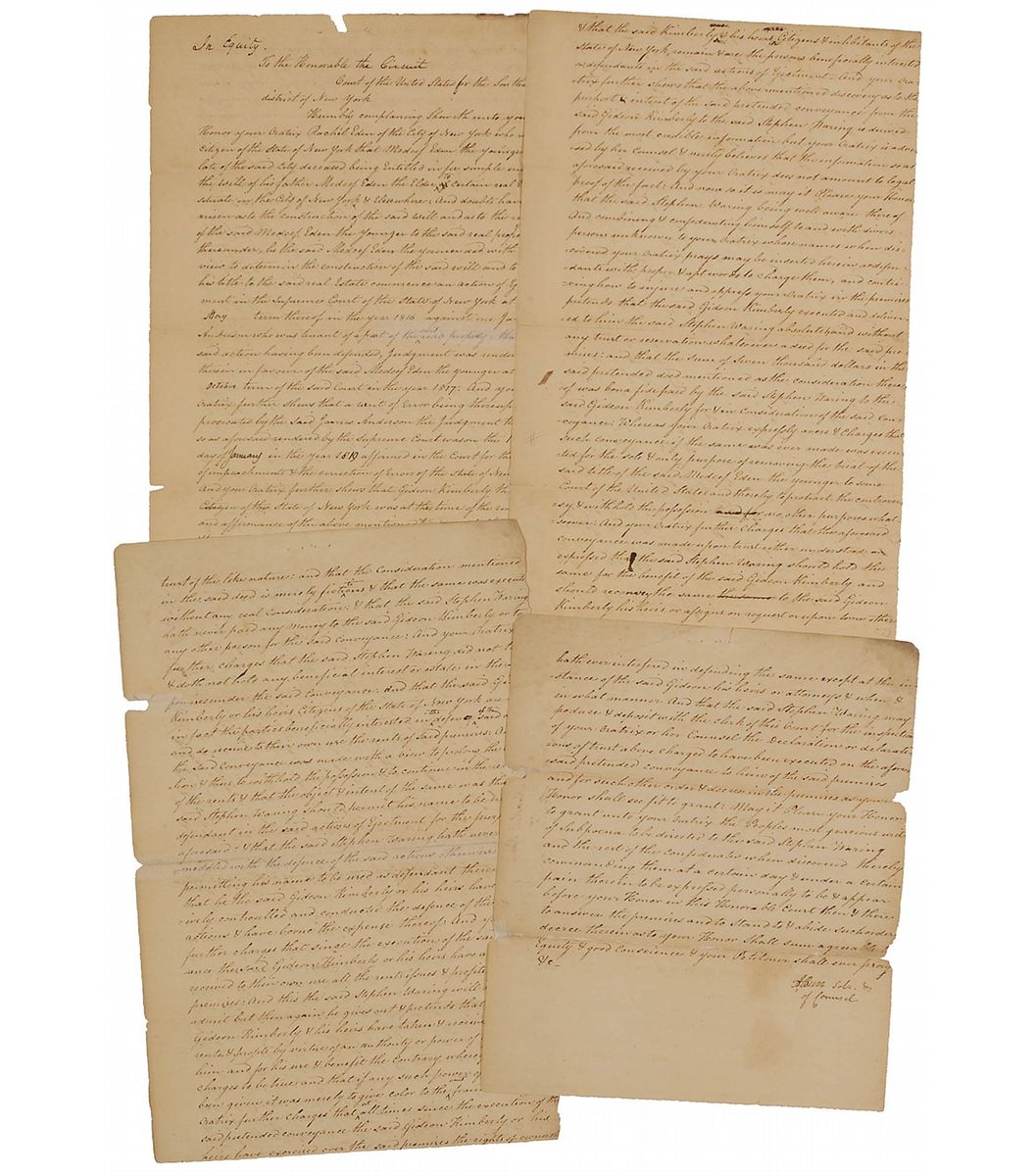 Manuscript DS, signed “A. Burr,” seven pages on four sheets, 7.75 x 12.5, September 22, 1824. A lengthy legal document concerning the case of Rachel Eden [Oratrix], v. Stephen Waring. Addressing the "Honorable the Circuit Court of the United States for the Southern District of New York Humbly complaining sheweth unto your Honor your Oratrix Racel Eden of the City of New York…that [her husband] Medcef Eden the younger …deceased being Entitled in fee simple under the will of his father Medcef Eden the Elder to certain real Estate situate in the City of New York & Elsewhere: And doubts having arisen as to the construction of the said will as to the right of the said Medcef Eden the Younger to the said real property thereunder." The lands in question included "numbers 38 & 40 situate on Gold Street." According to the document, tenant and pretend owner Gideon Kimberly, sold the property to a Stephen Waring for $7,000, and Burr, acting in behalf of the Oratrix Rachael Eden, asks the court for a Writ of Subpoena, "Please your Honor to grant unto your Oratrix the Peoples most gracious writ of Subpoena to be directed to the said Stephen Waring and the rest of the confederates when discovered thereby commanding them at a certain day &…there to answer the premises and to Stand to & abide such order decree." The document, completed in a secretarial hand includes several minor corrections in Burr's hand. Tape reinforcement to weak and partially separated horizontal folds, mild overall toning, a few chips to edges, last page shorter than first three, and pinholes to top edge, otherwise very good condition.