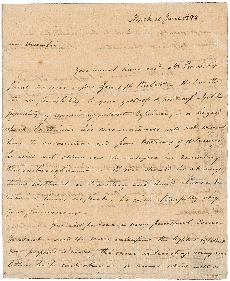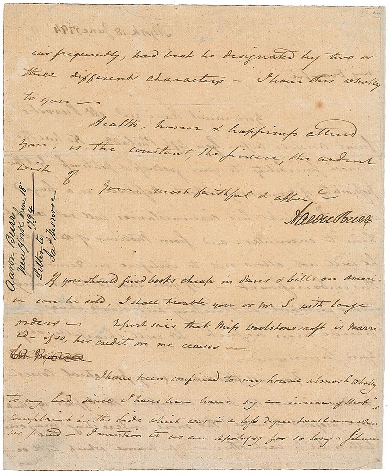 LS, one page both sides, 7.25 x 9, June 18, 1794. Burr writes to James Monroe. In part: “You must have recd. Mr. Prevost’s [probably a relation of his wife, the former Theodosia Prevost] final answer before you left Philad[elphi]a. He has the utmost sensibility to your goodness & politeness—yet the possibility of remaining without resources is a hazard which he thinks his circumstances will not warrant him to encounter: and from motives of delicacy he will not allow me to interfere in removing this embarrassment. If you should be at any time without a secretary and should choose to receive him as such, he will chearfully [sic] obey your summons. You will find me a very punctual correspondent—and the more extensive to cypher is (which you proposed to make) the more interesting may our letters be to each other. A name which will occur frequently, had best be designated by two or three different characters. I leave this wholly to you.” Burr continues with good wishes, plans to place “large orders…if you should find books cheaply,” and mentions that he has been “confined…almost wholly to my bed…by an increase of that complaint in the side.” Letter also bears a docketing notation in an unknown hand. Slight edge separations along faint intersecting folds, a uniform shade of mild toning, narrow mounting remnant to one margin, and light show-through of ink, otherwise fine condition.