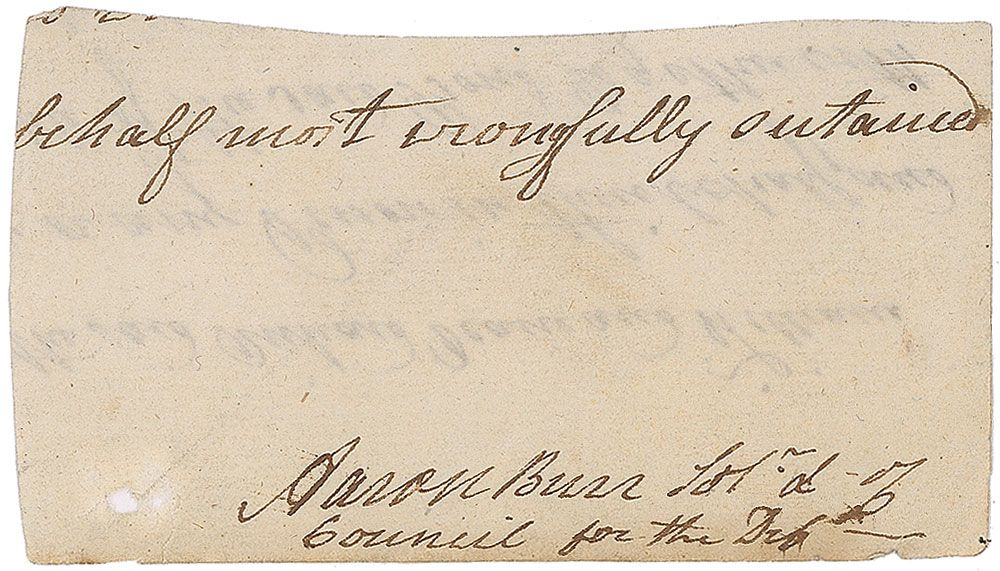 Ink signature, “Aaron Burr Sol. L. of Council for the Def.,” on an off-white 4 x 2 slip clipped from a larger document. In fine condition, with a small hole to the left of the signature and slight show-through from writing to reverse. Burr’s signature is not often seen in full.