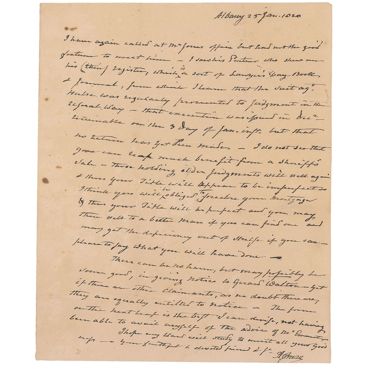 ALS signed “A. Burr,” one page, 7.75 x 9.5, January 25, 1820. Letter to Martha Bradstreet. In part: “I have again called at Mr. Jones office but had not the good fortune to meet him—I saw his Partner who shew me his register, which is a sort of Lawyer's Day-Book & Journal, from which I learned that the suit agt. Hulse was regularly presented to Judgment in the usual way—that execution was issued in Decr, returnable on the 3 Day of Jan. inst. But that no return has yet been made—I do not see that you can reap much benefit from a sheriff's sale—those holding older Judgments will sell again & then your Title will appear to be imperfect—I think you will be obliged to foreclose your mortgage & then your Title will be perfect and you may then sell to a better man if you can find one and may get the deficiency out of Hulse if you can—please to say what you will have done—There can be no harm, but may possibly be some good, in giving notice to Gerard Walton—yet if there are other claimants, as no doubt there are, they are equally entitled to notice—The form on the next leaf is the best I can devise, not having been able to avail myself of the advice of Mr. Emmet.” In fine condition, with intersecting folds and a few small stains to the left edge.