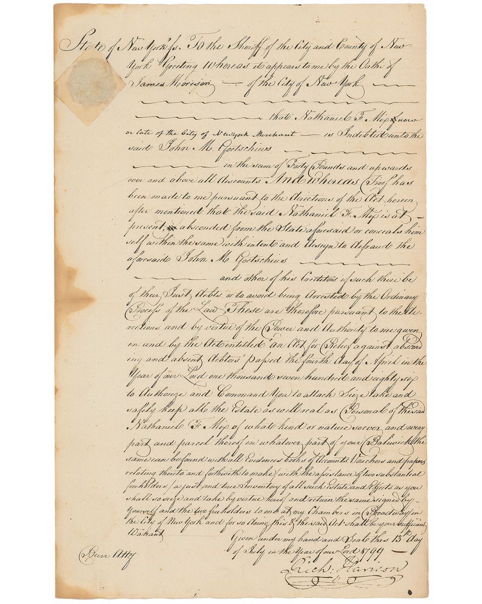 Unsigned docketing notation, “James Morrison v. Nathaniel F. Mix } attachment,” penned by Burr on the reverse of the second integral page of a manuscript legal document signed by Richard Harrison, one page, 8 x 12.75, July 13, 1799. An order to attach and seize the property of the indebted Nathaniel F. Mix. The white paper seal affixed to the upper left remains fully intact. Staining to one side (affecting a portion of Burr’s handwriting), and expected document wear, otherwise fine condition.