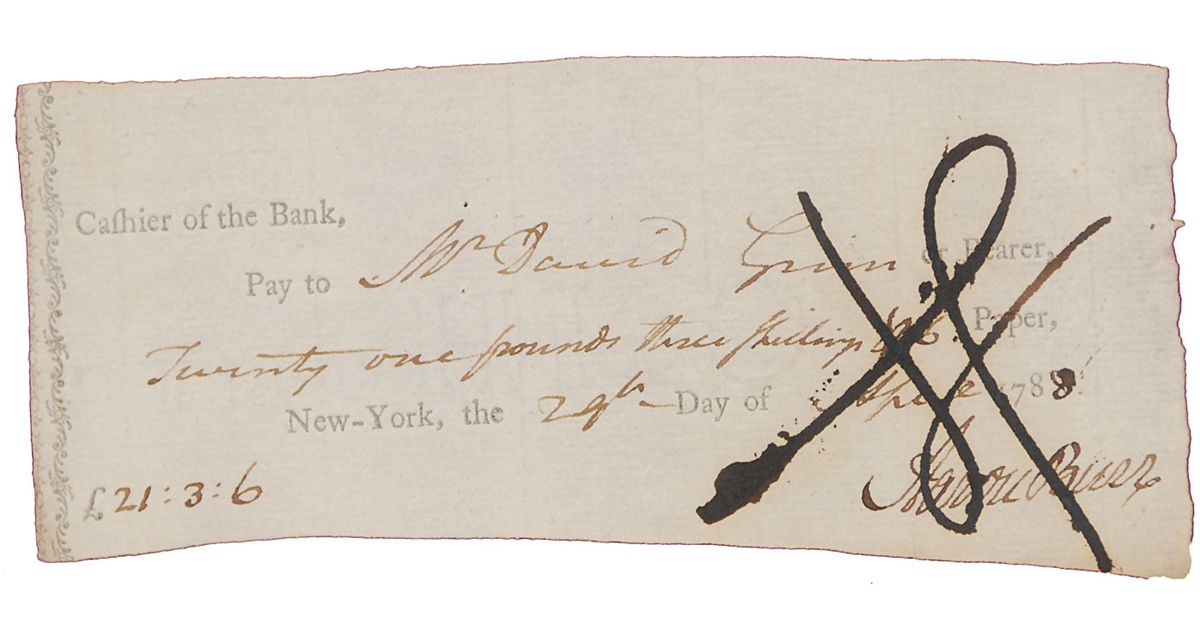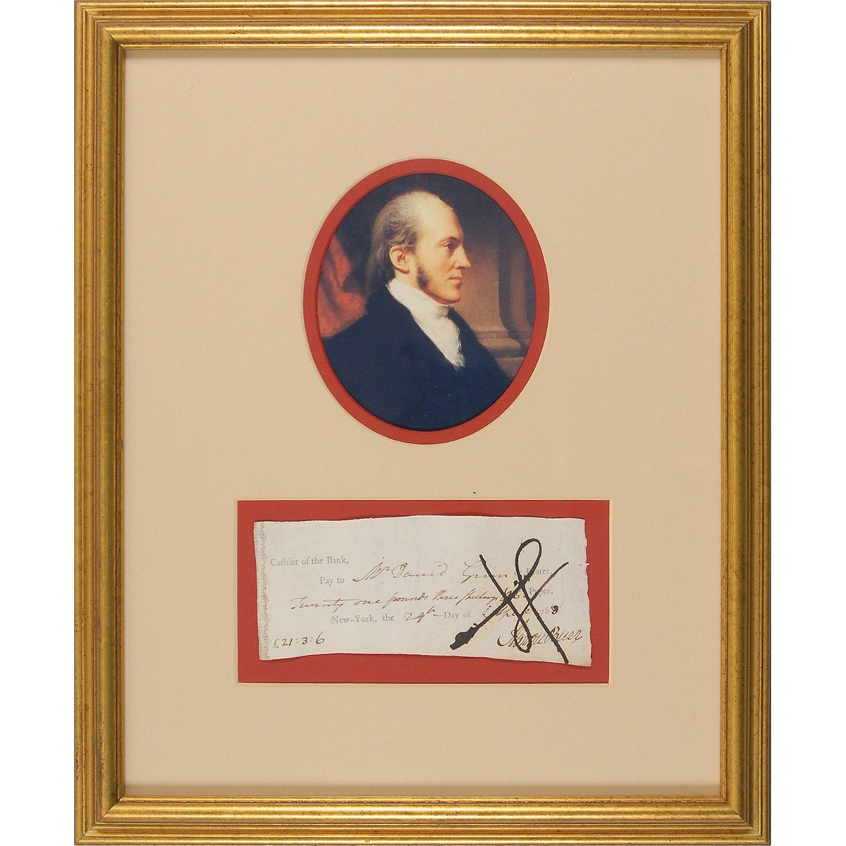Bank check, 6 x 2.5, filled out and signed by Burr, “Aaron Burr,” payable to Mr. David Guinn for £21.3.6, April 29, 1788. Nicely mounted, matted and framed with a color portrait to an overall size of 13 x 16. A heavy cancellation notation through the signature, otherwise fine condition. A less common example of Burr’s full signature, as he frequently signed using just his first initial.