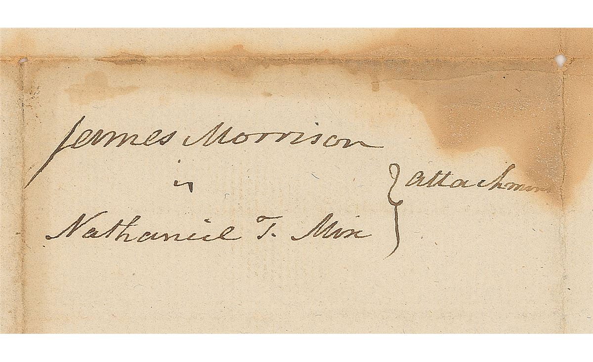 Unsigned docketing notation, “James Morrison v. Nathaniel F. Mix } attachment,” penned by Burr on the reverse of the second integral page of a manuscript legal document signed by Richard Harrison, one page, 8 x 12.75, July 13, 1799. An order to attach and seize the property of the indebted Nathaniel F. Mix. The white paper seal affixed to the upper left remains fully intact. Staining to one side (affecting a portion of Burr’s handwriting), and expected document wear, otherwise fine condition.