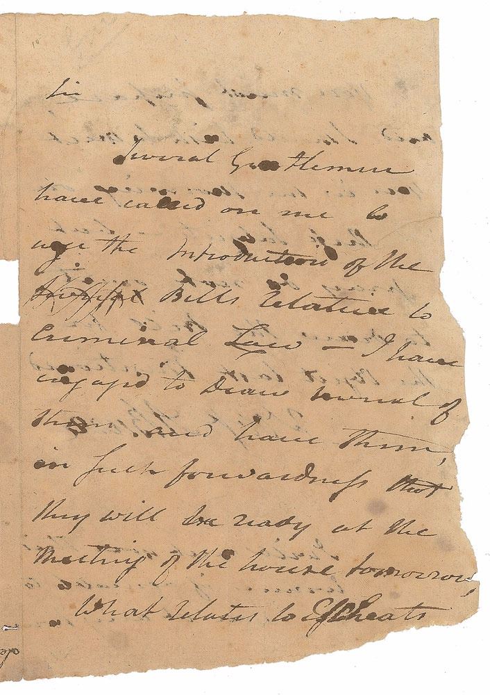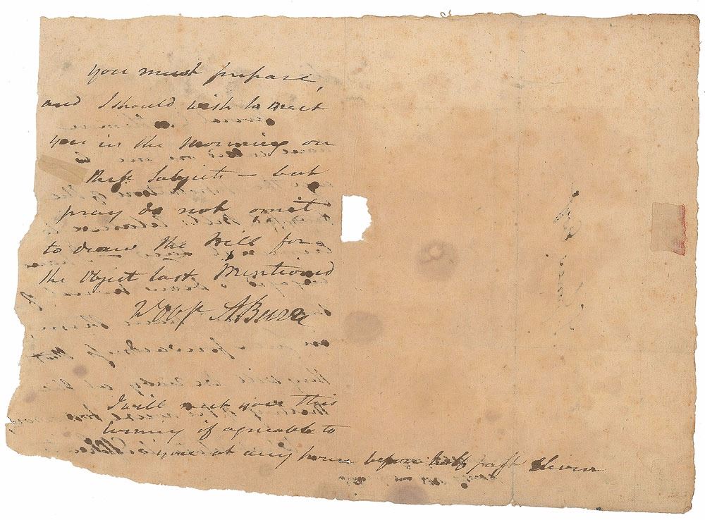 ALS signed “A. Burr,” one page both sides, 6 x 8.25, March 1791. Letter to New York Senator Samuel Jones, in part: "Several gentlemen have called on me to urge the introduction of the bills relative to Criminal law—I have engaged to draw several of them, and have them, in such forwardness that they will be ready at the meeting of the House tomorrow…pray do not omit to draw the Bill for the object last mentioned." Burr adds a brief postscript: "I will meet you this evening if agreeable to you at any hour before half past eleven." In very good condition, with staining, foxing, paper loss to the edges, and several small old tape repairs. In March 1791, Burr was elected by the legislature as a US Senator from New York, defeating the incumbent General Philip Schuyler (the father-in-law of Burr's rival Alexander Hamilton, who Burr would famously kill in an 1804 duel).