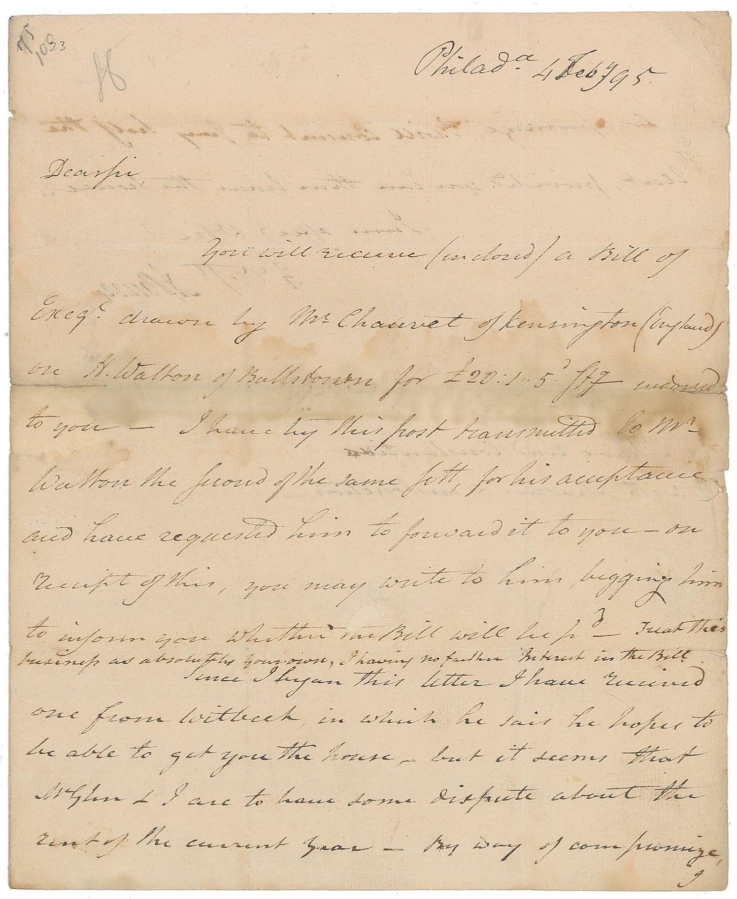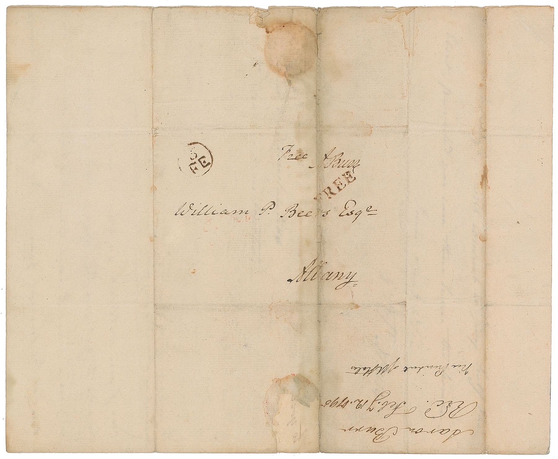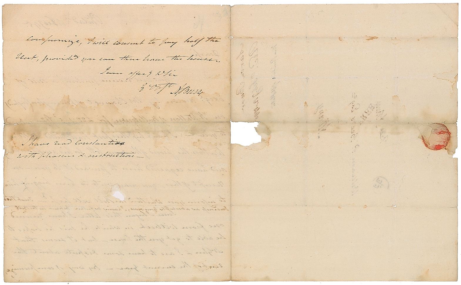 ALS signed “A. Burr,” one page both sides, 8 x 10, February 4, 1795. Letter to William P. Beers in Albany, in part: "You will receive (enclosed) a Bill of Exeq'r drawn by Mr. Chauvet of Kensington (England) on H. Walton…for £20.1.5…Treat this business as absolutely as your own, I having no further Interest…Since I began this letter I have received one from Witbeck, in which he said he hopes to be able to get you the house…I will consent to pay half the rent, provided you can there have the house." Addressed on the integral leaf in Burr's hand, and franked at the top, "Free, A. Burr." In very good condition, with light staining and splitting along one of the horizontal folds, one small area of paper loss, and seal-related paper loss to the integral address leaf.