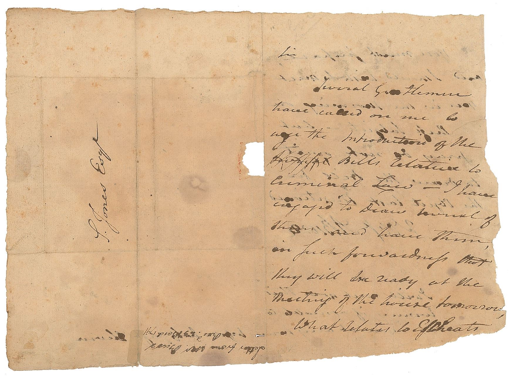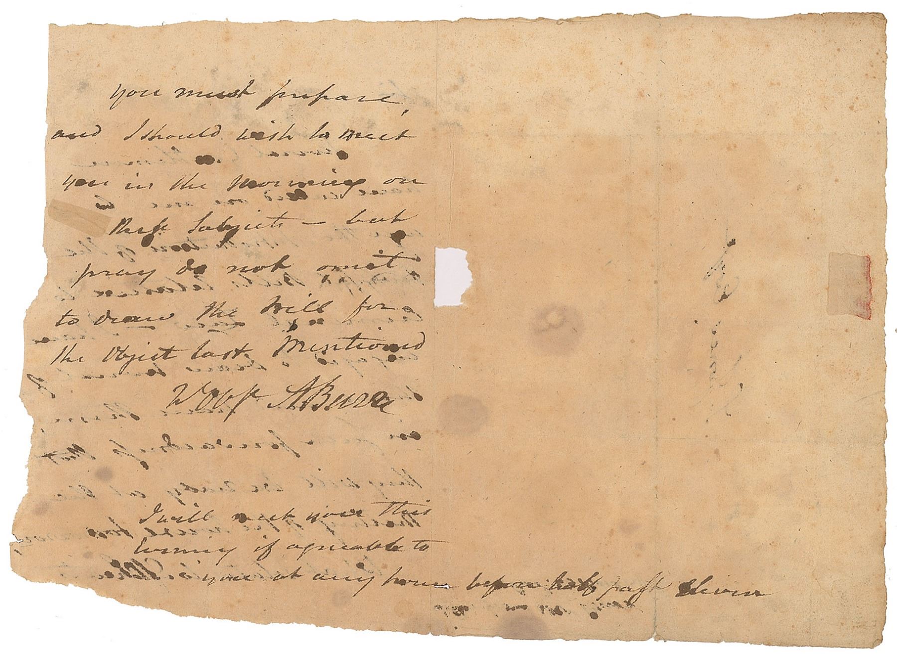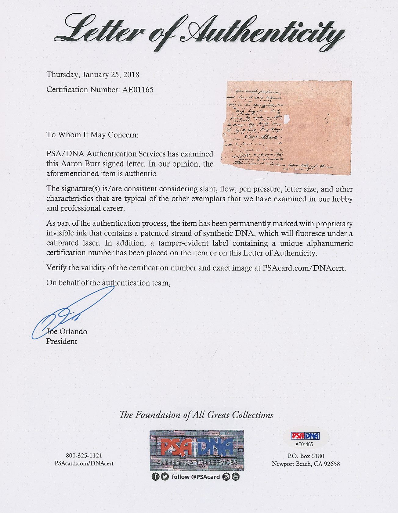 ALS signed “A. Burr,” one page both sides, 6 x 8.25, March 1791. Letter to New York Senator Samuel Jones, in part: "Several gentlemen have called on me to urge the introduction of the bills relative to Criminal law—I have engaged to draw several of them, and have them, in such forwardness that they will be ready at the meeting of the House tomorrow…pray do not omit to draw the Bill for the object last mentioned." Burr adds a brief postscript: "I will meet you this evening if agreeable to you at any hour before half past eleven." In very good condition, with staining, foxing, paper loss to the edges, and several small old tape repairs. In March 1791, Burr was elected by the legislature as a US Senator from New York, defeating the incumbent General Philip Schuyler (the father-in-law of Burr's rival Alexander Hamilton, who Burr would famously kill in an 1804 duel). Accompanied by a full letter of authenticity from PSA/DNA.