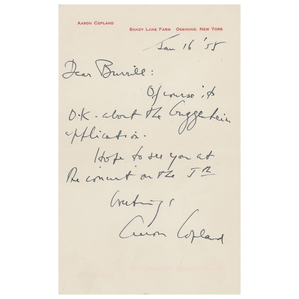 ALS, one page, 5 x 7.75, personal letterhead, January 16, 1955. Handwritten letter to composer Burrill Phillips, in full: "Of course it is O.K. about the Guggenheim application. Hope to see you at the concert on the 5th." In fine condition. Phillips, an American composer, teacher, and pianist, received Guggenheim fellowships in 1942‰ÛÒ43 and 1961‰ÛÒ62.