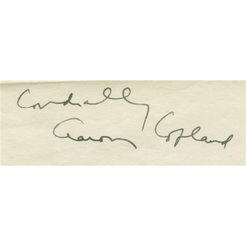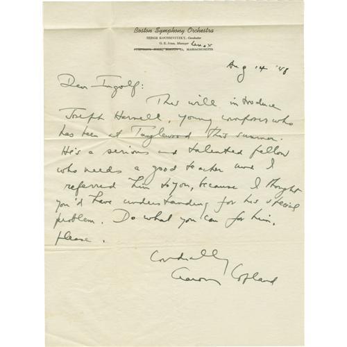 <B>Aaron Copland Signed Letter.</B></I> A single-page handwritten letter on Boston Symphony Orchestra letterhead, dated August 14, 1948, and signed by the famous composer in black ink. Addressed to composer Ingolf Dahl, the letter references a young Joseph Harnell (then Copland's student at Boston University's Tanglewood Institute), who would later become a famous television and film music composer. In Very Fine to Excellent condition with some heavy mailing creases.<BR><BR><b>Shipping:</b> Flat Material, Small (<a target="_blank" href="http://www.heritageauctions.com/common/shipping.php">view shipping information</a>) <BR><BR><B>Important notice: