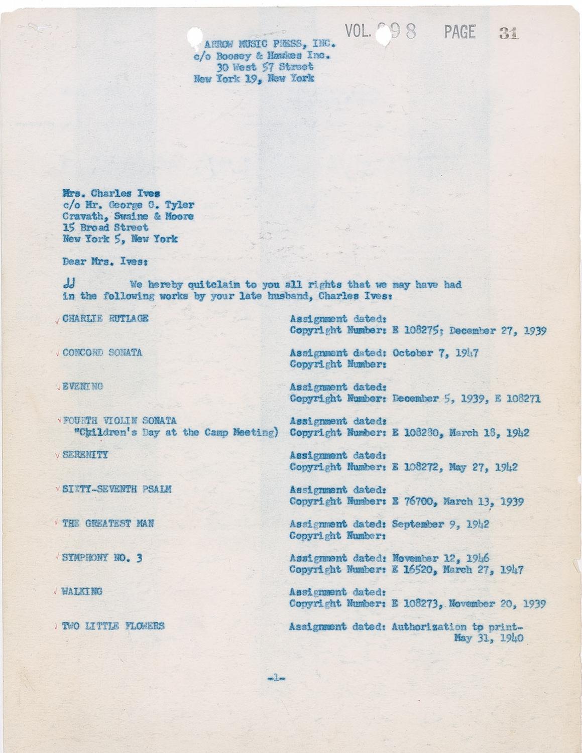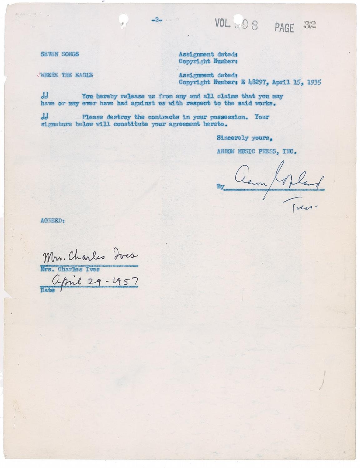 DS, signed “Aaron Copland, Treas.,” two pages, 8.5 x 11, April 29, 1957. Agreement between Arrow Music Press, Inc. and the widow of Charles Ives. In part: “We hereby quitclaim to you all rights that we may have had in the following works by your late husband, Charles Ives…You hereby release us from any and all claims that you may have or may ever have had against us with respect to the said works. Please destroy the contracts in your possession. Your signature below will constitute your agreement here.” Works involved are ‘Charlie Rutlage,’ ‘Concord Sonata,’ ‘Evening,’ ‘Fourth Violin Sonata,’ ‘Serenity,’ Sixty-Seventh Psalm,’ ‘The Greatest Man,’ ‘Symphony No. 3,’ ‘Walking,’ ‘Two Little Flowers,’ ‘Seven Songs,’ and ‘Where the Eagles.’ In very good condition, with horizontal folds, light creasing, wrinkling, two filing punch holes at the top of the page, staple holes at the upper left corner and along the left side, and office stamps.