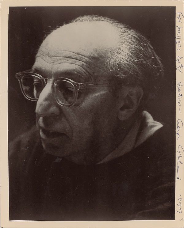 Glossy 8 x 10 close-up photo, signed and inscribed in blue ballpoint “For Am Vets #75, Greetings—Aaron Copland.” A few light creases and surface marks, minor skipping to signature and inscription, and curling to horizontal edges, otherwise fine condition.