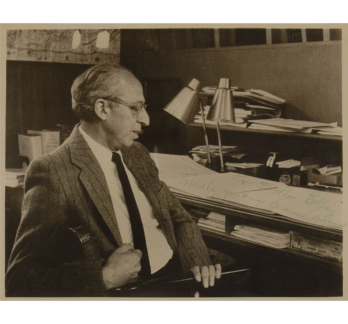 Glossy 9.75 x 8 photo of Copland going over some scores, signed and inscribed in green ballpoint “For Esther Ballow, Friendly greetings, Aaron Copland.” Matted and framed to an overall size of 14.5 x 13. In fine condition, with some light crazing to the emulsion and the inscription and signature a shade light.