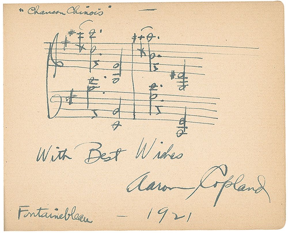 Rare AMQS on an off-white 4.5 x 3.75 album page within a larger autograph album. Copland pens two double bars of ‘Chanson Chinois,’ signing below, “With best wishes, Aaron Copland, Fontainebleau, 1921.” In fine condition, with mild toning to borders. Also