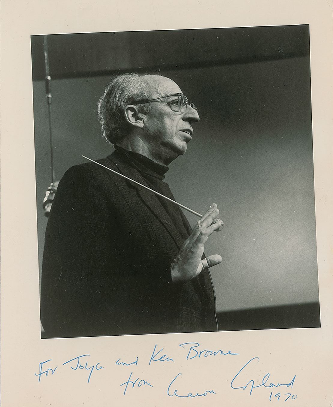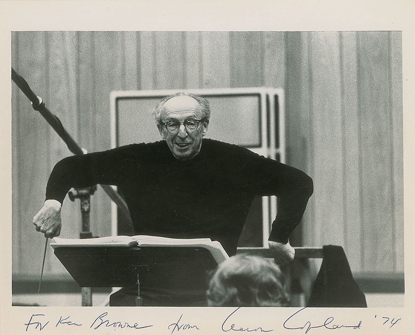 Two glossy photos, 8 x 10 and 10 x 8, both depicting Aaron Copland conducting with baton in hand, both signed and inscribed in ballpoint by the composer, who dates the photos to "1970" and "'74." In overall very good to fine condition, with creases and surface impressions.