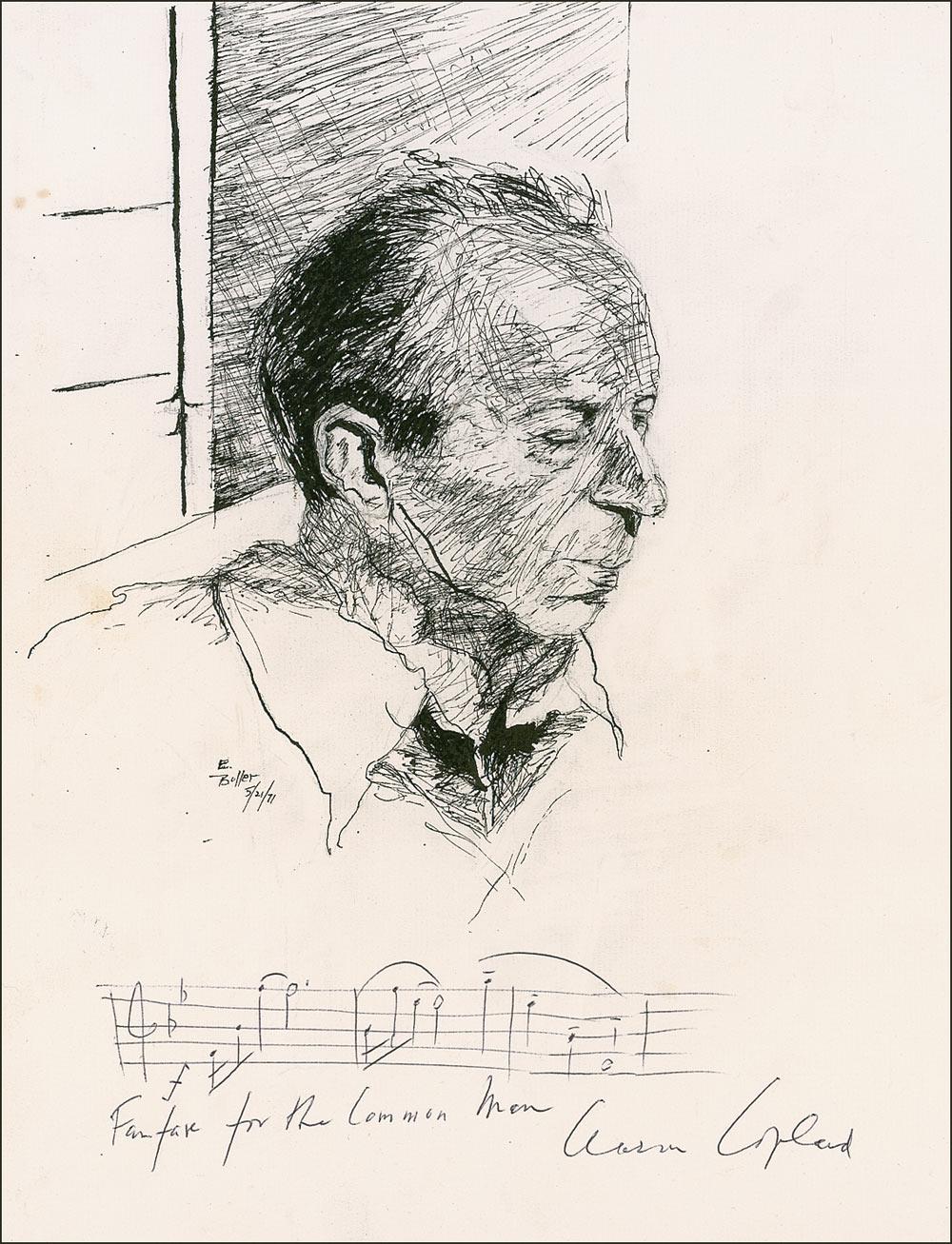 AMQS at the bottom of an original ink sketch of Copland, done in another hand, and signed by the artist, “E. Boller 5/21/71.” At the bottom, Copland pens three bars of music from ‘Fanfare for the Common Man,’ and signed underneath, “Aaron Copland.” In fine condition, with a couple spots of trivial foxing to left edge.