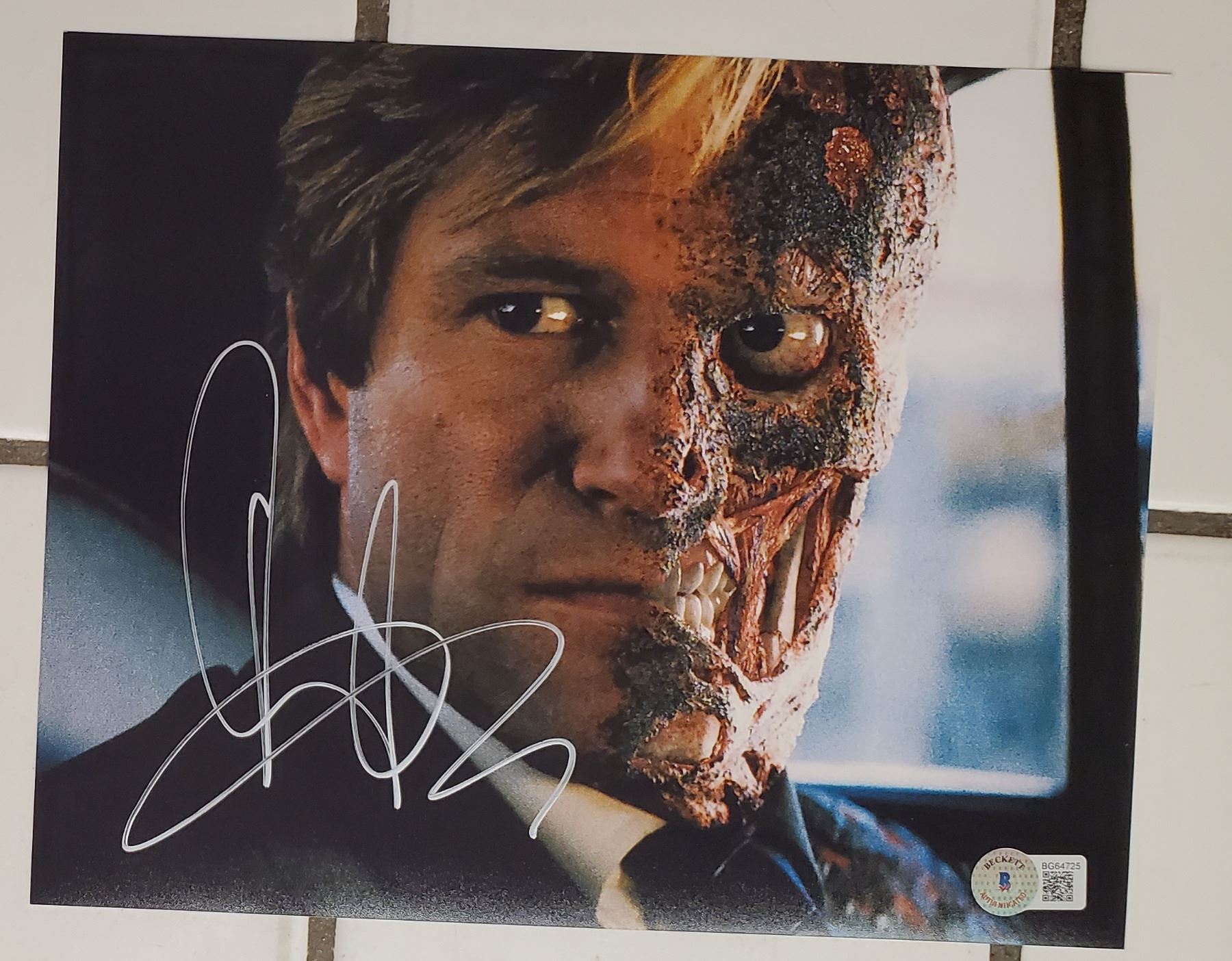 An 8” x 10” photograph signed by Aaron Eckhart. The autograph is authenticated by Beckett who issued a COA numbered BG64725 (sticker only).