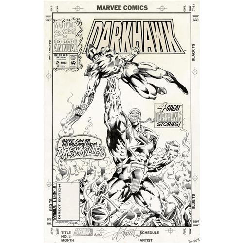 <B>Aaron Lopresti and Bob Wiacek - Darkhawk Annual #2 Cover Original Art (Marvel, 1993).</B></I> There can be no escape from the Dreamkiller! Christopher Powell faces the awesome astral might of Alex Tennyson, in this deadly cover illustration. The art includes the original logo and masthead paste-ups, and has an image area measuring 9.75" x 15". In Excellent condition. Signed by Aaron Lopresti at the bottom.<BR><BR><b>Shipping:</b> Small Flat (<a target="_blank" href="http://www.heritageauctions.com/common/shipping.php">view shipping information</a>)