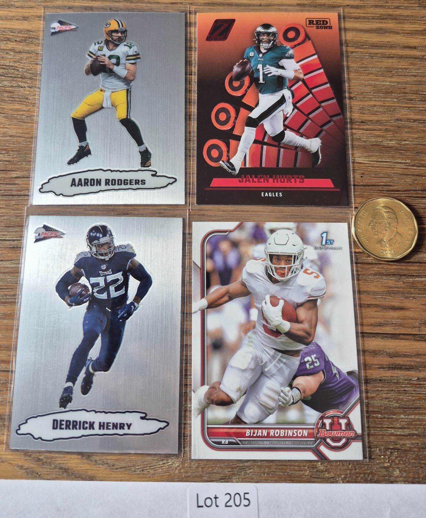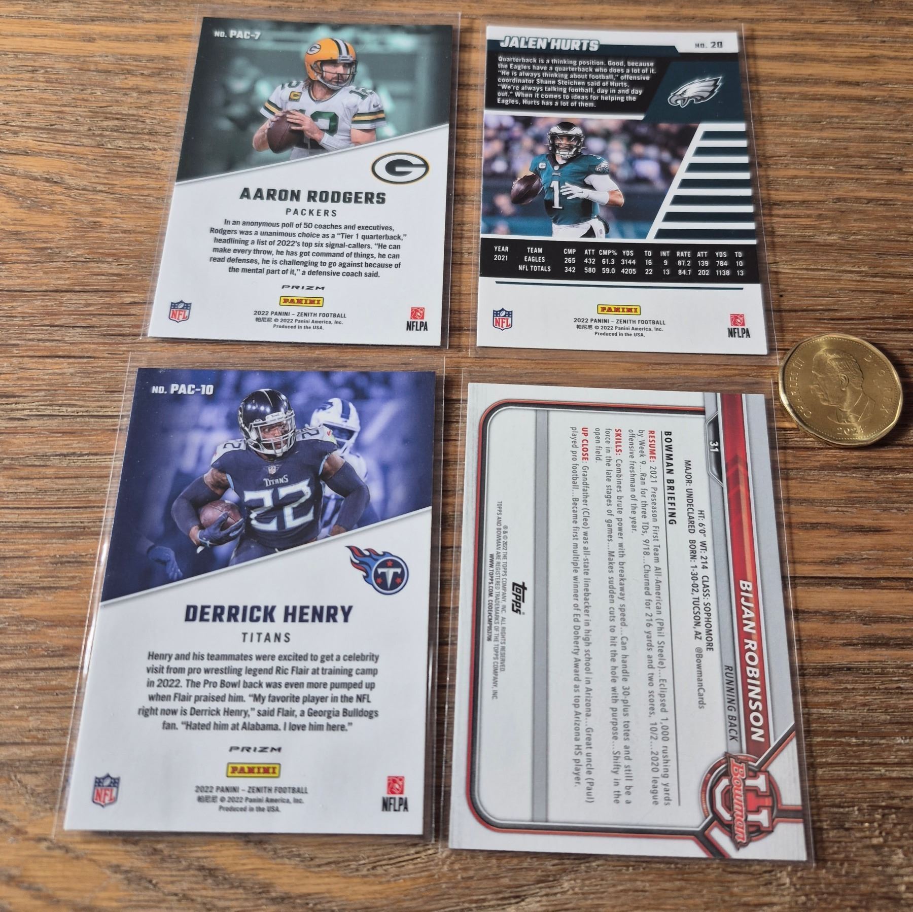 Four-card mix featuring Aaron Rodgers, Derrick Henry, Jalen Hurts, and Bijan Robinson across Pacific, Zenith, and Bowman releases. All cards in excellent to mint condition.